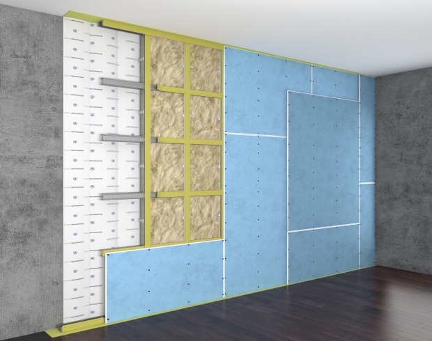 Каркасная система звукоизоляции стен с использованием звукоизоляционного мата и базальтовых плит